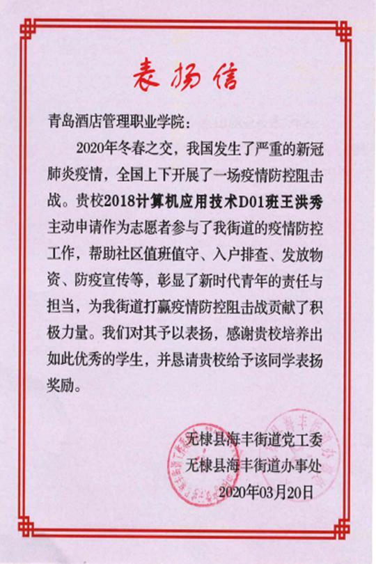 日前,青島酒店學院收到了來自濱州市無棣縣海豐街道黨工委和青島市市北區寧夏路街道發來的表揚信,贊揚學院青年團員王洪秀、李柞鋅作為志愿者在當地疫情防控工作中作出的貢獻。