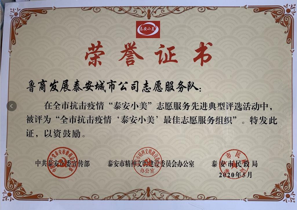 責(zé)任國(guó)企,抗疫先鋒。近日,魯商發(fā)展泰安城市公司志愿服務(wù)隊(duì)榮獲由泰安市委宣傳部、市民政局頒發(fā)的“泰安小美”最佳志愿服務(wù)組織獎(jiǎng)。
