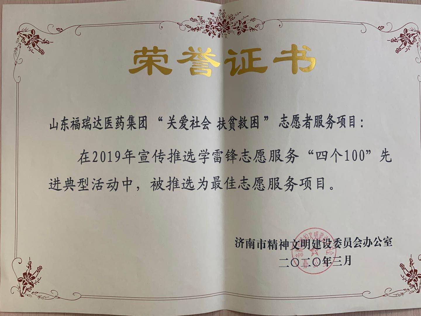 近期,福瑞達(dá)“關(guān)愛(ài)社會(huì)、扶貧救困”志愿服務(wù)項(xiàng)目在2019年度宣傳推選學(xué)雷鋒志愿服務(wù)“四個(gè)100”先進(jìn)典型中,被推選為“濟(jì)南市最佳志愿服務(wù)項(xiàng)目”。