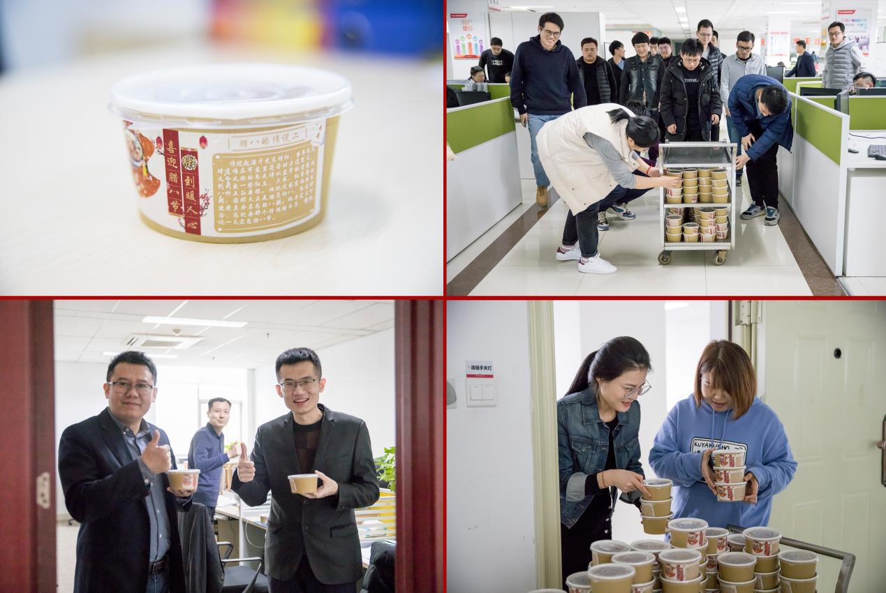 活動中,工作人員推著滿滿一車新鮮出爐、熱氣騰騰的臘八粥逐層為每一位員工送去節日祝福。一碗碗突然出現的臘八粥讓大家喜出望外,一份份貼心的祝福讓大家倍感溫暖。值得注意的是,此次臘八粥的包裝特別采用了可降解的紙質碗包裝,旨在透過寓意吉祥的臘八粥傳播環保理念,讓垃圾減量和綠色環保意識更加深入人心。此外,易通工會還在包裝盒的外側粘貼了印有“傳說小故事”的貼紙,讓大家了解臘八節的歷史淵源,在享受美食的同時收獲知識。