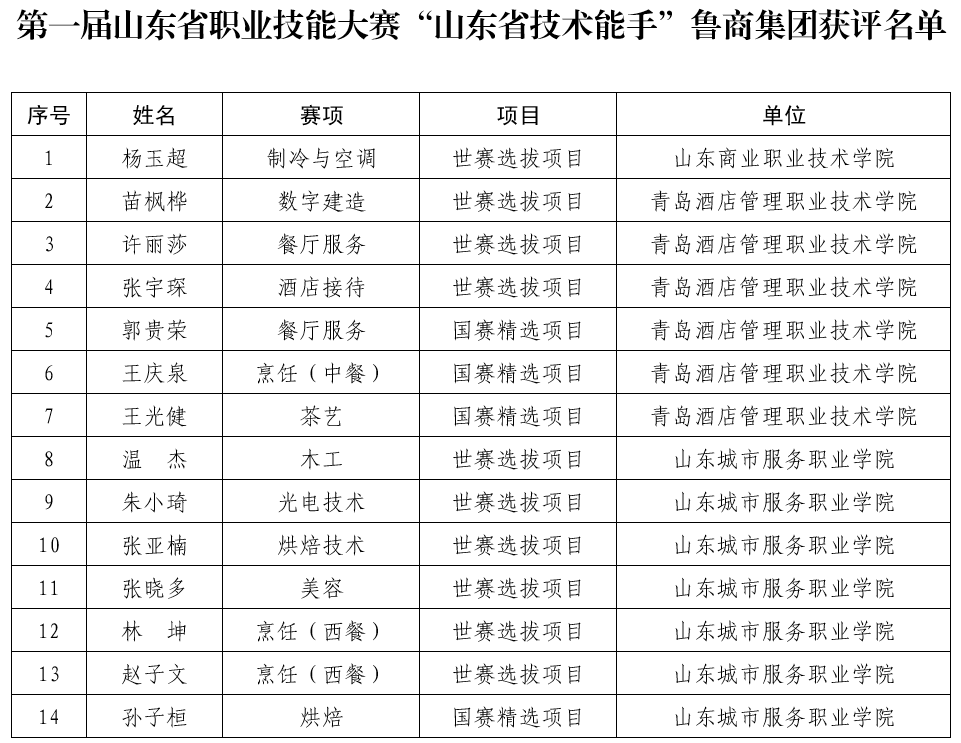 7月14日,省人社廳公布第一屆山東省職業(yè)技能大賽“山東省技術能手”名單,魯商集團3所院校共14名師生獲評,其中山東商職學院1人、青島酒店學院6人、山東城市學院7人。