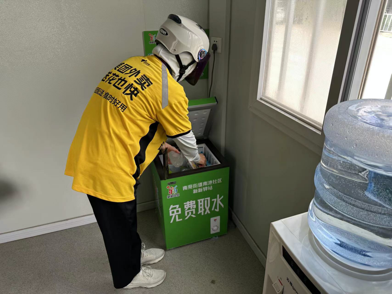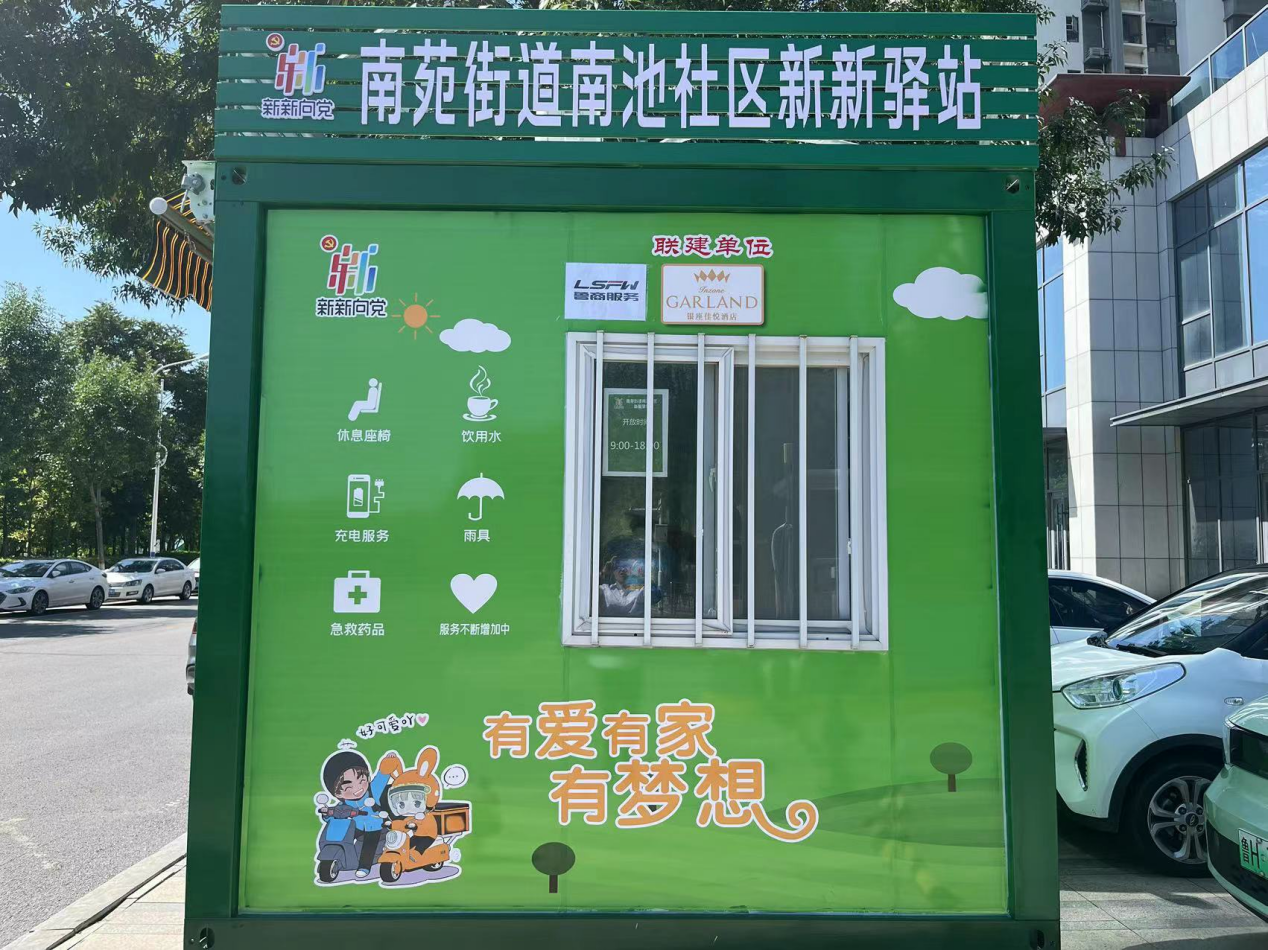 “新新驛站”是將閑置的核酸采樣亭進行煥新改造,內設空調、冰箱、飲水機、座椅、充電器、雨傘、急救藥品箱、打氣筒、花露水、血壓計等便民設施及物品,為小區業主、快遞員、出租車司機、環衛工人及外賣員提供便利服務和休息場所。
