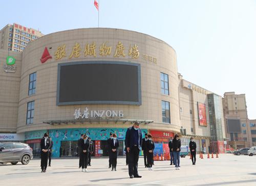 銀座淄博淄城店員工在正門舉行哀悼活動(dòng),敬獻(xiàn)一份哀思。
