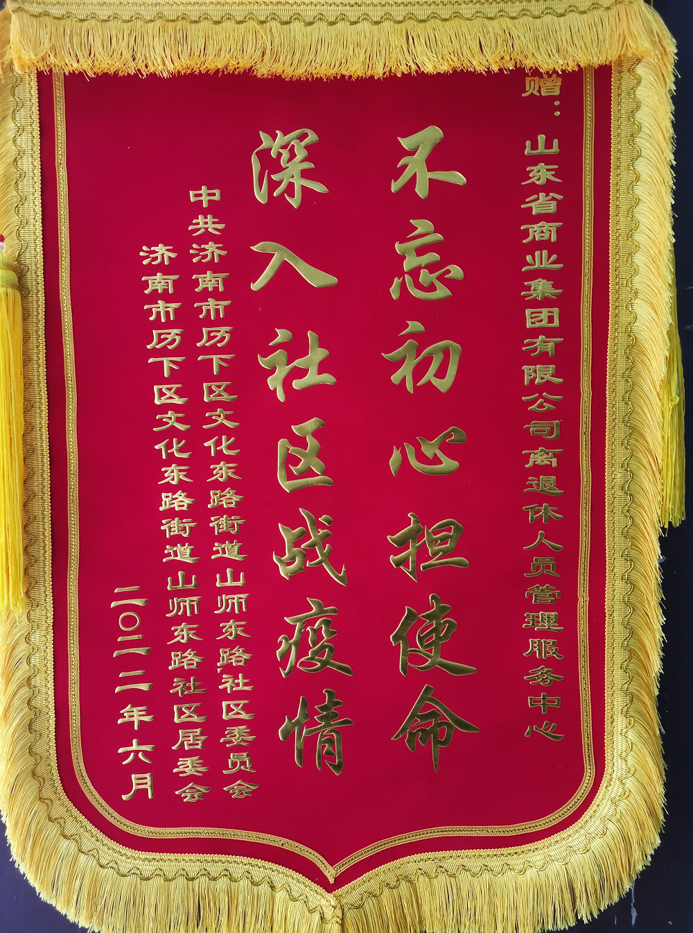 6月28日,濟(jì)南市歷下區(qū)文東街道山師東路居委會為集團(tuán)離退中心送來“不忘初心擔(dān)使命 深入社區(qū)戰(zhàn)疫情”錦旗,對離退中心在社區(qū)疫情防控工作中給予的大力支持表示感謝。