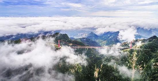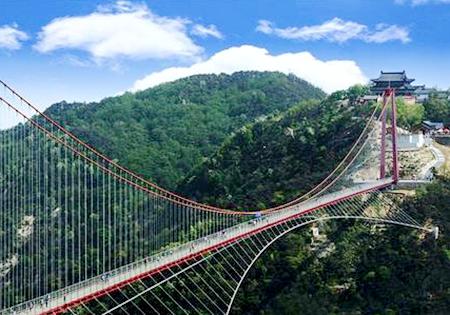 據了解,目前世界上較長的懸索橋有瑞士的歐洲之橋(494米)、德國的“泰坦-RT”步行懸索橋(458米)、俄羅斯的索契天空公園橋(439米)、中國湖南張家界玻璃橋(430米)。而銀座天蒙景區的人行懸索橋全長505.5米,在被群山環繞的天蒙景區里,它橫跨兩座山峰,凌空而起,是連接玉皇宮和望海樓兩個重要景點的交通要道。該人行索橋的建成避免了游客穿過深達143米的婁子溝,節約40分鐘的行程。