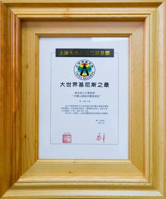 日前,沂蒙山銀座天蒙旅游區的“網紅景點”——人行懸索橋通過大世界基尼斯總部權威認證,獲得“大世界基尼斯之最”證書。這標志著天蒙山全長505.5米的人行懸索橋成功入選大世界基尼斯之最,被確認為最長人行懸索橋。