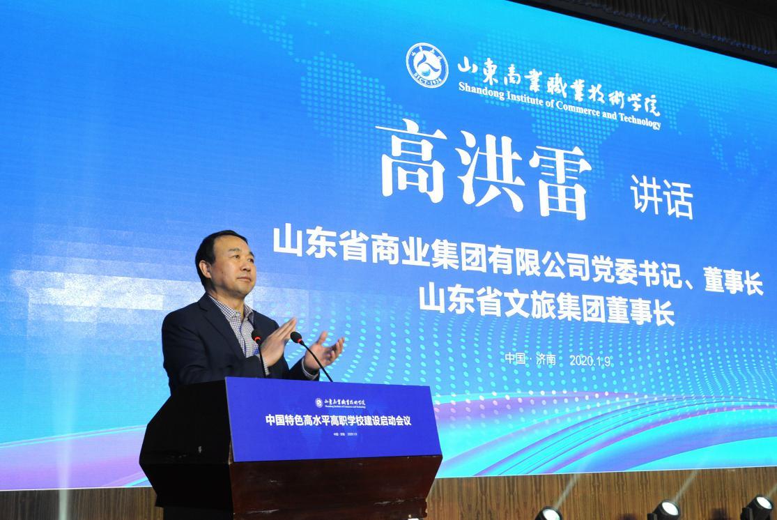 高洪雷在講話中說,魯商集團近年來充分發揮企業辦學優勢,各院校辦學水平和特色持續提升。集團辦學過程中得到多位省市領導和主管部門的關心支持,省委常委、宣傳部部長關志鷗2019年兩次到山東商院調研,要求把學校打造成全國職業院校排頭兵。此次山東商院被列為特高校第一類A檔重點建設單位,是集團與山東商院在省委省政府堅強領導下,在主管部門大力支持下,打造全國職業院校排頭兵征途上邁出的重要一步。魯商集團將積極履行“服務山東大局、服務人民大眾”的國企使命,進一步發揮企業辦學主體作用,幫助優化辦學機制、創新辦學模式、提升辦學水平。期望各級主管部門一如既往地關心支持魯商集團特別是山東商院的發展。希望山東商院以此為契機,實現“一個轉變”,即由培養就業人才向培養創業人才轉變,實現“一個跨越”,即由全國高水平高職學校向世界一流職業學??缭?。