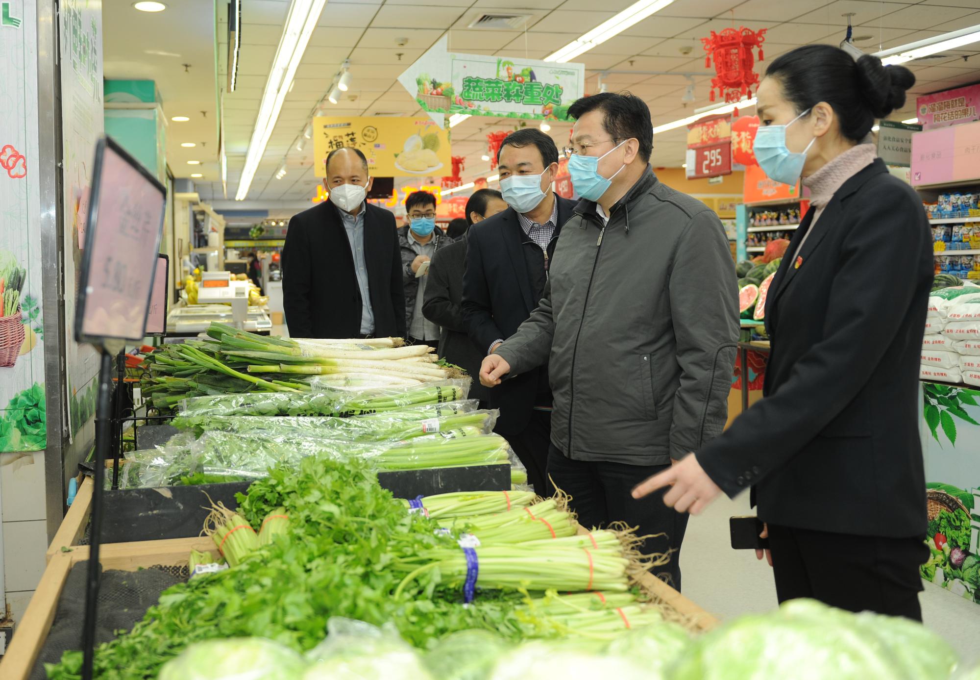在經過體溫測量與檢查口罩是否合規后,張斌一行進入店內。張斌首先察看了消殺用品專區,詢問了目前消殺用品的供應情況。隨后,他又來到生鮮商品區,察看蔬菜價格與產地,并向相關負責人詢問蔬菜供應情況。濟南銀座購物廣場店負責人介紹,針對市民最關心的米面油、蔬菜、水果、肉蛋等民生商品,銀座集團在年前就已加大市場采購量,日備貨量遠遠大于平日,目前貨源充足,物價平穩。