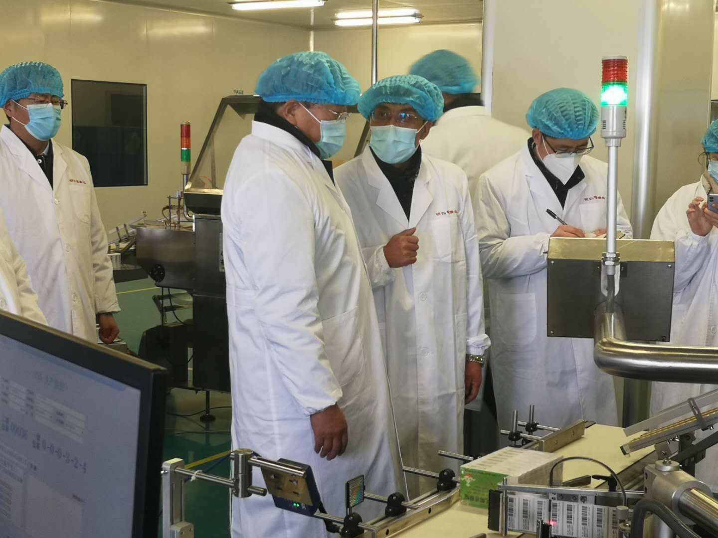 經(jīng)過(guò)體溫測(cè)量、消毒等程序后,王忠林進(jìn)入公司口服固體車間,參觀了抗疫藥物“小兒解感顆粒”包裝生產(chǎn)線,檢查了防疫措施落實(shí)和執(zhí)行情況,并詳細(xì)詢問(wèn)了口罩、酒精、消毒劑和生產(chǎn)原料等物資的儲(chǔ)備狀況。明仁福瑞達(dá)嚴(yán)格按照各級(jí)政府和魯商集團(tuán)規(guī)定,制定了新冠肺炎疫情防控工作措施、實(shí)施方案、應(yīng)急預(yù)案和開工方案,將體溫測(cè)量、出行登記、消毒、宣傳教育以及廠區(qū)、辦公區(qū)、餐廳等各項(xiàng)防疫措施做到實(shí)處,并在車間、辦公區(qū)和餐廳配備了全自動(dòng)感應(yīng)式霧化酒精消毒機(jī),確保防疫措施責(zé)任到人,監(jiān)督到位,所有人員保護(hù)到位。王忠林對(duì)此給予充分肯定,要求濟(jì)南市企業(yè)推廣“福瑞達(dá)消毒模式”。
