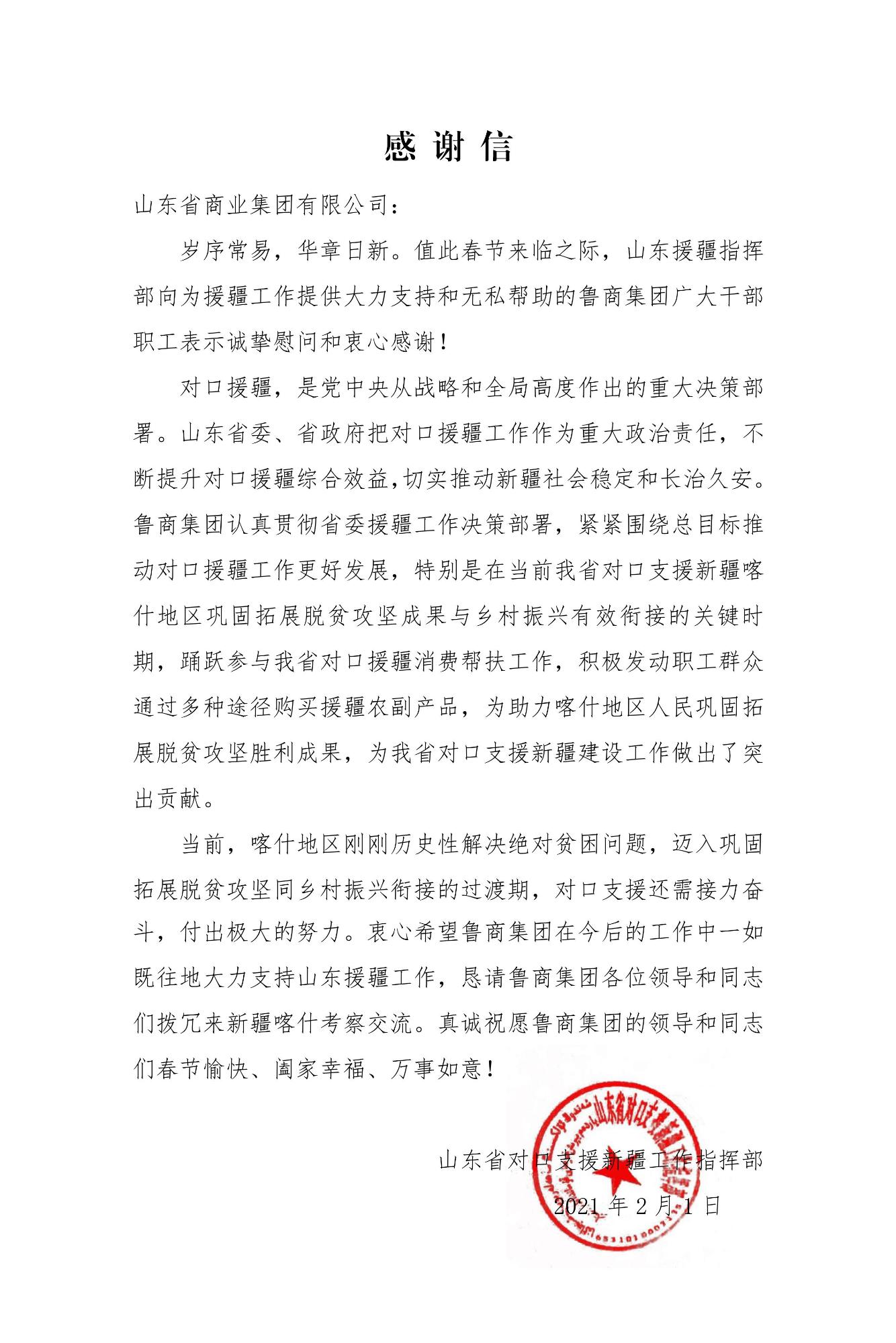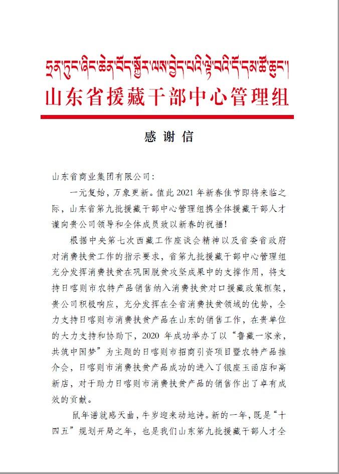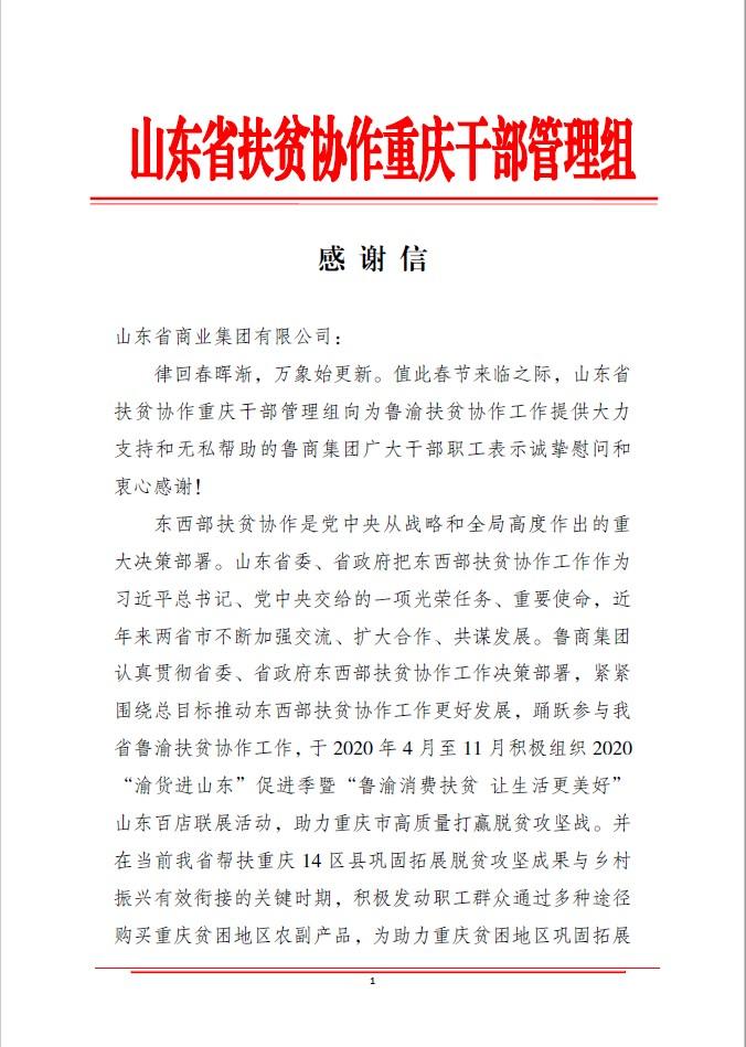 感謝信中表示,魯商集團(tuán)認(rèn)真貫徹省委省政府有關(guān)東西部扶貧協(xié)作工作決策部署,緊緊圍繞總目標(biāo)推動對口支援工作更好發(fā)展,踴躍參與我省對口支援消費(fèi)幫扶工作,積極發(fā)動職工群眾通過多種途徑購買幫扶農(nóng)副產(chǎn)品,為助力西部人民鞏固拓展脫貧攻堅勝利成果,為我省對口支援西部地區(qū)建設(shè)工作作出了突出貢獻(xiàn)。尤其是在成功舉辦以“魯藏一家親,共筑中國夢”為主題的日喀則市招商引資項(xiàng)目暨農(nóng)特產(chǎn)品推介會、“渝貨進(jìn)山東”促進(jìn)季暨“魯渝消費(fèi)扶貧讓生活更美好”山東百店聯(lián)展活動等方面,積極發(fā)揮魯商集團(tuán)產(chǎn)業(yè)鏈長的優(yōu)勢,充分利用集團(tuán)零售業(yè)的品牌資源,助力扶貧事業(yè)發(fā)展。
