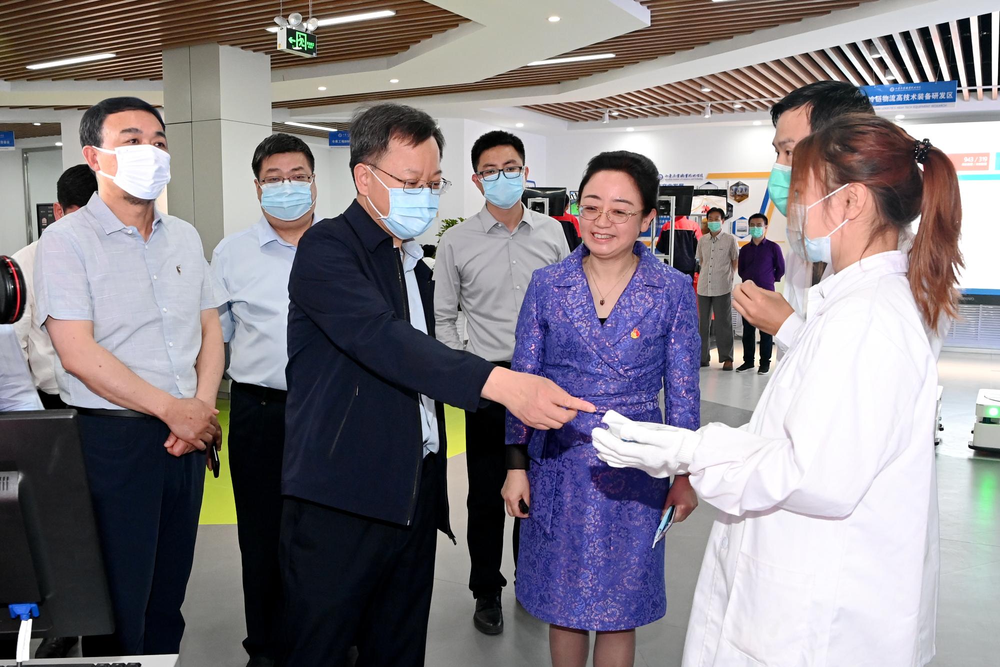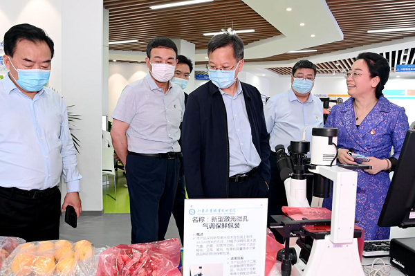 調研過程中,王心富詳細了解了學校建設的智慧農業大數據管理平臺運營情況及基于蜜桃保鮮研發的農產品跨境物流品控集成技術,參觀了CO2跨臨界制冷技術、水產品馴化喚醒技術、智慧倉儲裝備技術及國家級技能大師邱峰指導研發的激光導航AGV,觀看休眠超過24小時的大菱鲆的現場“復活”,詢問師生們針對山東縣域經濟發展開展的分析及消費行為研究成果。最后,王心富對學校康養文旅創新服務和科技成果轉移孵化進行了調研指導。對于一所高職院校所取得的諸多優秀科研成果,王心富給予高度肯定,對于學校積極服務經濟發展和鄉村振興戰略表示贊賞。