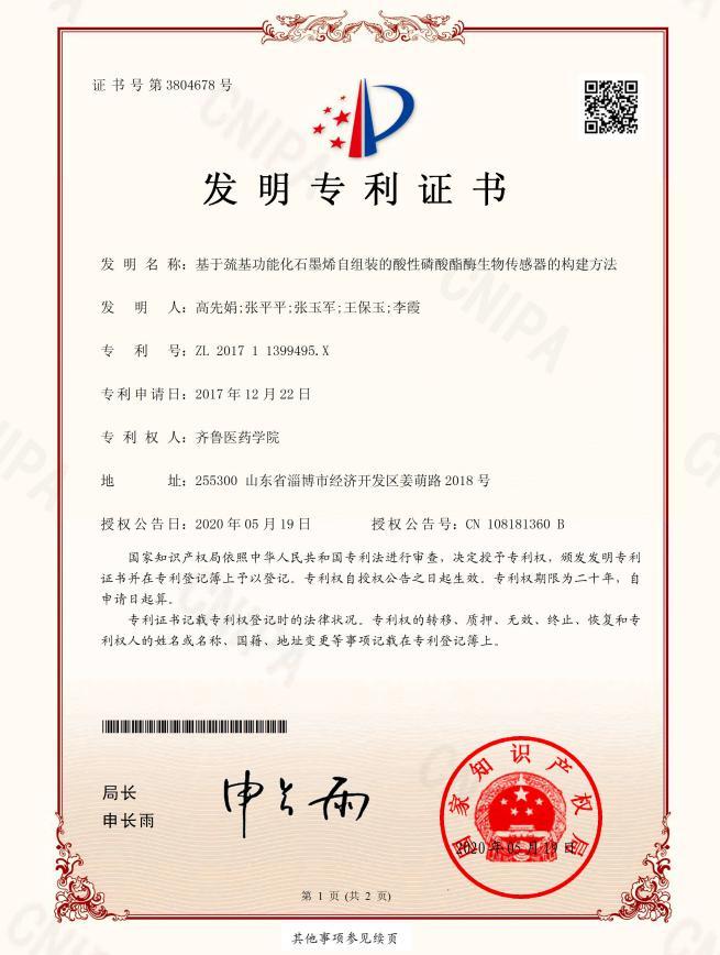 近日,齊魯醫(yī)藥學(xué)院教師高先娟、張平平、張玉軍,學(xué)生王保玉、教師李霞的自主研發(fā)成果《基于巰基功能化石墨烯自組裝的酸性磷酸酯酶生物傳感器的構(gòu)建方法》(專利號:ZL 201711399495.X)成功獲得國家發(fā)明專利。該成果于2017年12月申報,2020年5月獲得專利證書。