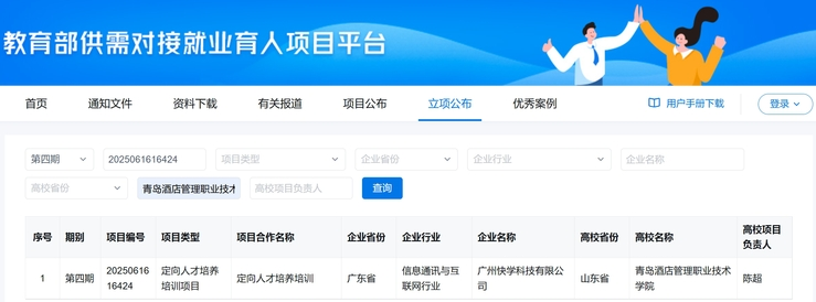 近日,教育部公布第四期最新供需對接就業育人項目名單,青島酒店管理職院文旅學院與廣州快學科技有限公司合作申報的“定向人才培養培訓項目”入選。此次合作是深入踐行“企業出題、校企共答、市場閱卷”產教深度融合理念的生動實踐,為職業教育創新型人才培養模式落地提供了鮮活案例。