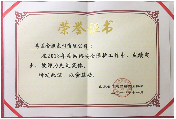 易通金服支付有限公司主營預付卡、收單、互聯網支付三大業務,以獨立的自有平臺系統為支撐,全天候、不間斷強化實時監測,超常規做好日常網絡信息安全保障工作,打造網絡安全企業,確保公司業務的穩健發展。濟南市公安局特推薦易通金服支付有限公司為“2018年度網絡安全保護工作先進集體”,后經山東省信息網絡安全協會專家組評審,授予該項榮譽稱號。