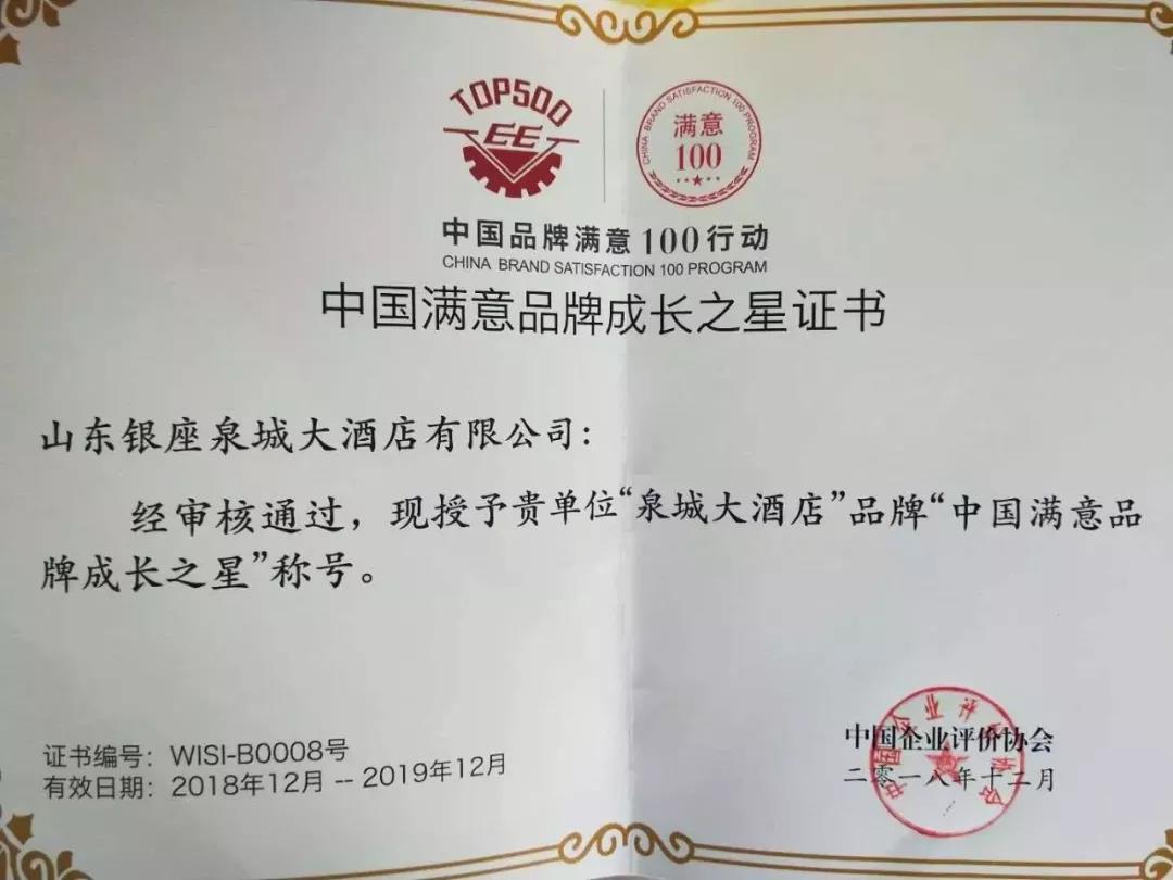 銀座泉城大酒店榮獲“中國滿意品牌成長之星”稱號
