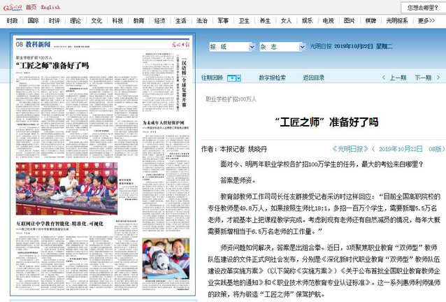 媒體報道稱,學院扎實落實教師聯系企業制度15年,全院專任教師累計完成4輪赴企業掛職鍛煉,“雙師型”教師占90%以上,高水平雙師隊伍建設取得積極成效。近年來,學院貫徹落實全國教育大會精神和《國家職業教育改革實施方案》,通過拓展雙師素質培養平臺、服務企業發展和大型賽會、建立“校中廠”師資培訓基地、積極承擔社會服務工作等,逐步打造了一支“專業在前沿、行業有影響、國際可交流”的雙師隊伍,為學院發展提供了有力支撐,也為職業教育高水平雙師隊伍建設提供了經驗做法。