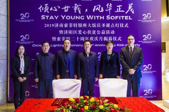 11月22日,濟南索菲特銀座大飯店精心打造了一場獨特的法式主題點燈儀式,為酒店20周年歡慶月揭開精彩序幕。現場,濟南索菲特銀座大飯店與濟陽區旅游促進服務中心共同啟動濟陽區愛心扶貧公益活動。