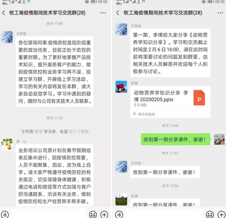活動以“牧工商疫情期間技術(shù)學(xué)習(xí)交流”微信群為平臺,由技術(shù)人員精心準(zhǔn)備動物營養(yǎng)、產(chǎn)品知識等方面的課件,全體銷售人員在線上學(xué)習(xí)的基礎(chǔ)上,通過問答討論、答疑解惑的形式,提升學(xué)習(xí)效果。活動要求,全體銷售人員積極通過電話和微信等方式加強與客戶的溝通聯(lián)系,洽談有關(guān)業(yè)務(wù),做到疫情防控和生產(chǎn)經(jīng)營兩不誤。