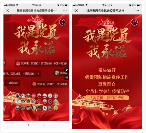 當(dāng)前,疫情防控形勢依然嚴(yán)峻。2月8日,銀座家居黨委要求廣大黨員干部帶頭落實疫情防控責(zé)任,帶頭落實各項疫情防控措施,號召全體黨員堅持共同抗擊疫情,認真承諾踐行,切實發(fā)揮先鋒模范作用。銀座家居黨委書記、董事長張慶勝帶頭簽訂《抗擊疫情承諾書》,并鼓勵全體黨員干部群眾團結(jié)一心,筑牢疫情防控堡壘,樹牢堅決打贏疫情阻擊戰(zhàn)的信心。各級黨組織利用微信群等多種線上方式,組織廣大黨員干部簽訂《抗擊疫情承諾書》,并將黨員簽訂好的承諾書以圖片形式存檔,確保黨旗在每一個疫情防控的陣地高高飄揚。截至目前,全體黨員共簽訂298份《抗擊疫情承諾書》。大家在承諾踐諾留言墻表示,在目前疫情防控的關(guān)鍵時刻,作為一名黨員,一定不忘初心、牢記使命,為打贏疫情防控阻擊戰(zhàn)貢獻自己的一份力量。