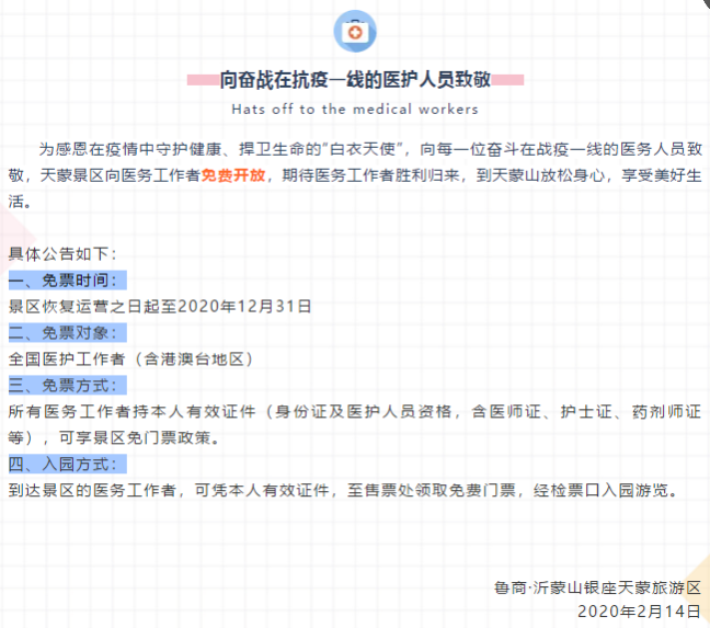 致敬逆行,感恩天使。為向奮戰在抗擊新冠肺炎疫情一線的醫務工作者致敬,2月14日,山東省文旅集團與全國省級國有集團聯盟共同發起“勝利后,讓我們重啟2020的美好”——致敬白衣戰士愛心公益活動,省文旅集團旗下魯商·銀座天蒙旅游區、魯商·新泰新甫山景區率先發布公告,2020年內向全國醫務工作者免費開放,邀請他們在戰勝疫情后到景區放松身心。