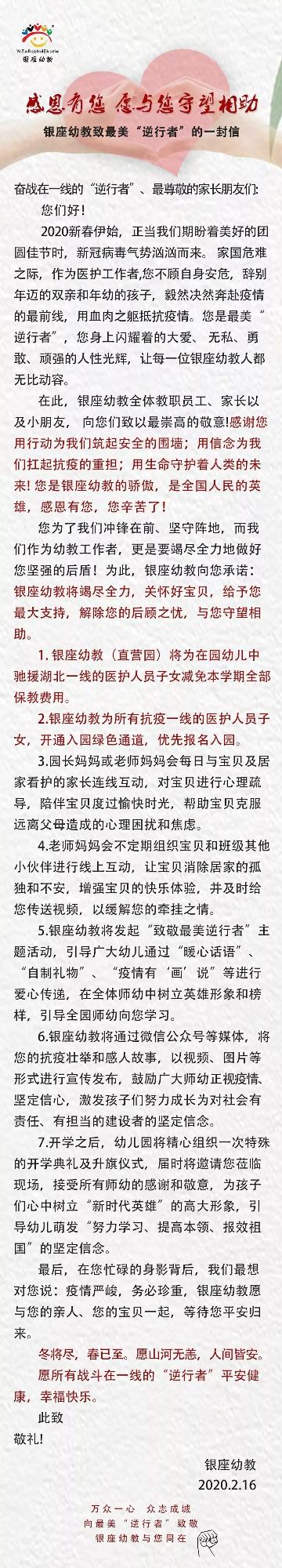 2月16日,銀座幼教發布“致最美‘逆行者’的一封信”——《感恩有您 愿與您守望相助》。銀座幼教(直營園)將為在園幼兒中馳援湖北一線的醫護人員子女減免本學期全部保教費用。同時,還將為所有戰疫一線的醫護人員子女開通入園綠色通道,優先報名入園。
