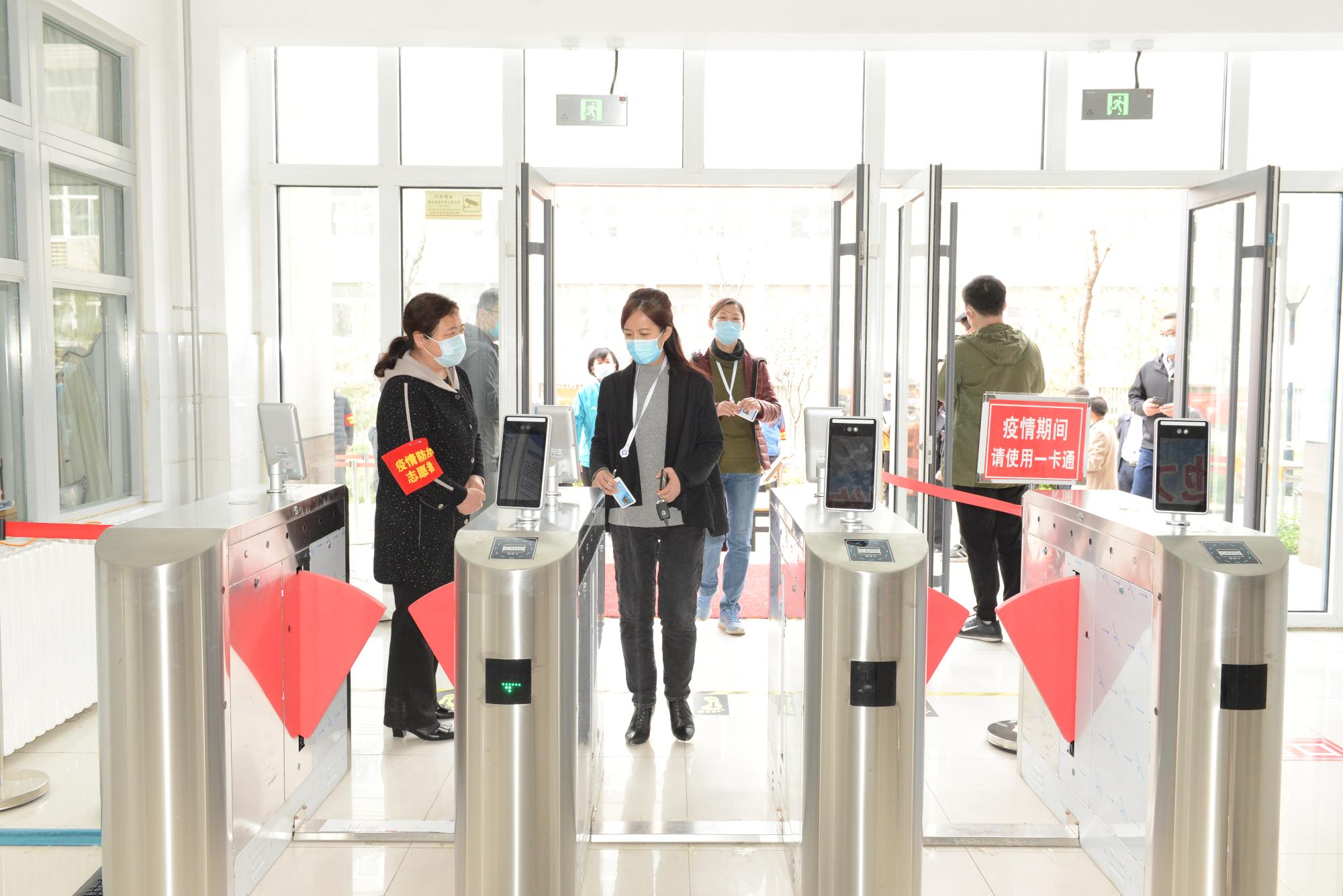 在公寓門口,演練人員佩戴口罩間隔1米依次排隊測體溫、消毒后,持一卡通通過門禁,再持樓層出入證進行體溫登記后進入房間。現場還模擬了體溫異常學生處置流程。
