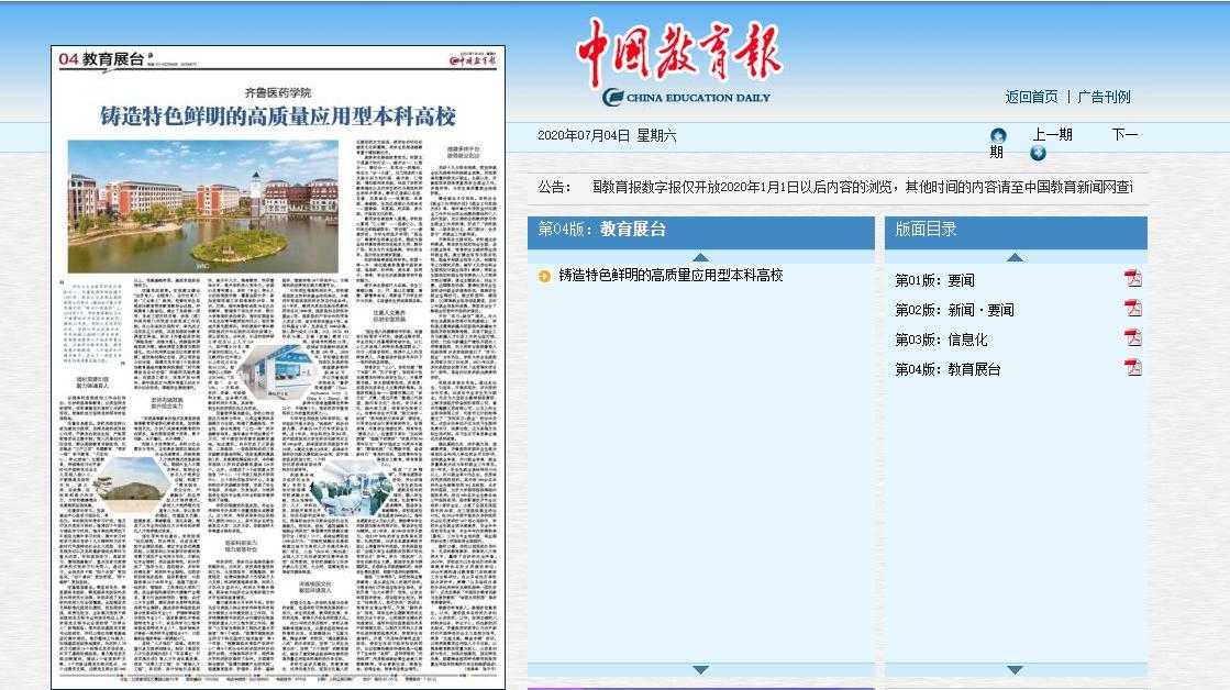 7月4日,《中國教育報》第4版以《齊魯醫藥學院:鑄造特色鮮明的高質量應用型本科高校》為題,整版報道學院辦學情況。