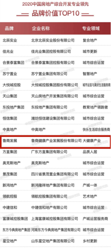 9月10日,“2020中國房地產(chǎn)品牌價(jià)值研究成果發(fā)布會暨第十七屆中國房地產(chǎn)品牌發(fā)展高峰論壇”在北京召開,會上隆重發(fā)布了《2020中國房地產(chǎn)品牌價(jià)值研究報(bào)告》。作為深耕大健康產(chǎn)業(yè)的魯商發(fā)展入圍2020中國房地產(chǎn)綜合開發(fā)專業(yè)領(lǐng)先品牌價(jià)值TOP10榜單,并同時榮膺2020中國山東半島城市群行業(yè)品牌價(jià)值TOP10榜單第二位。