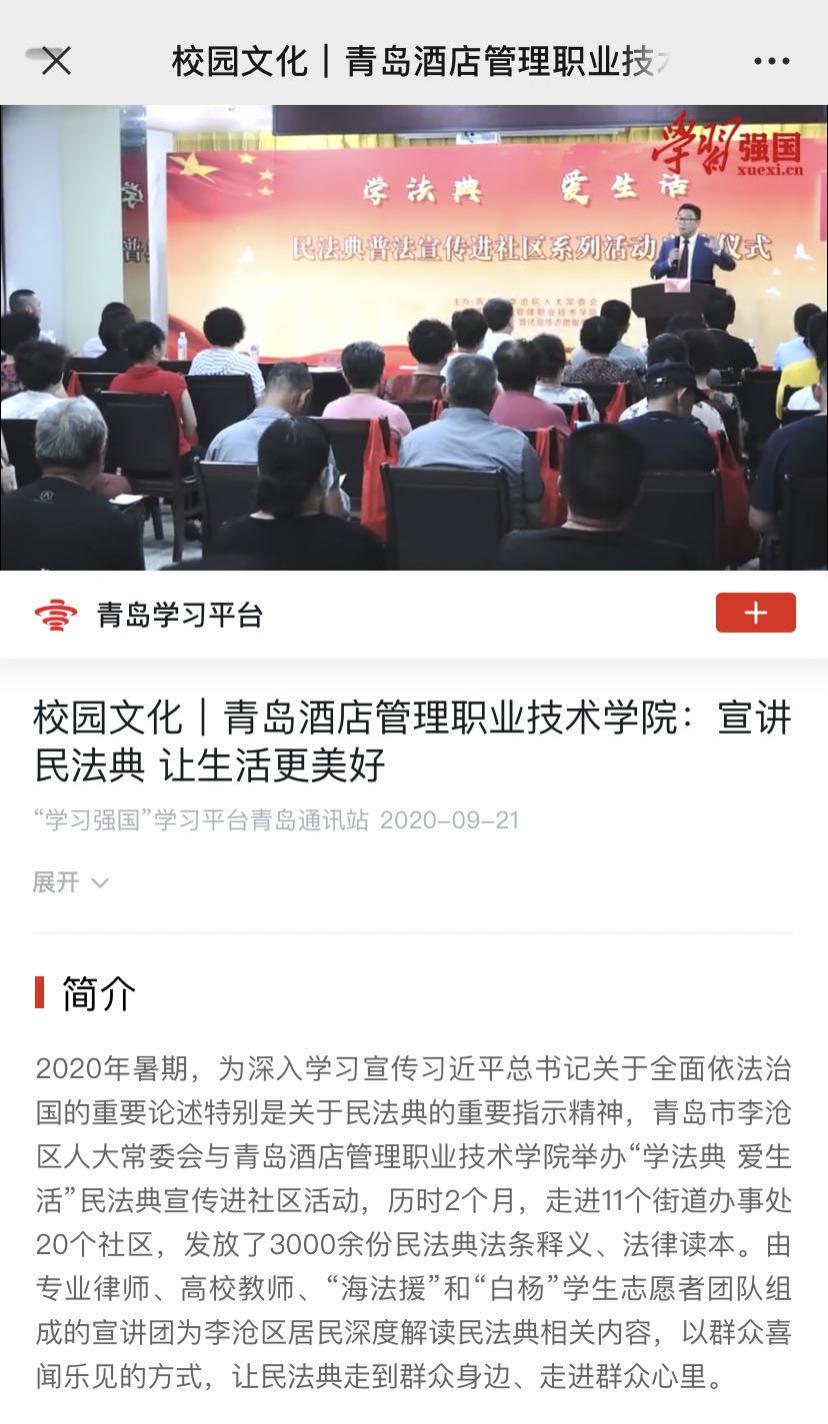 法入民心,“典”亮生活。近日,由青島酒店學院信息工程技術學院黨總支開展的“學法典 愛生活”《民法典》宣傳進社區活動登上“學習強國”學習平臺。
