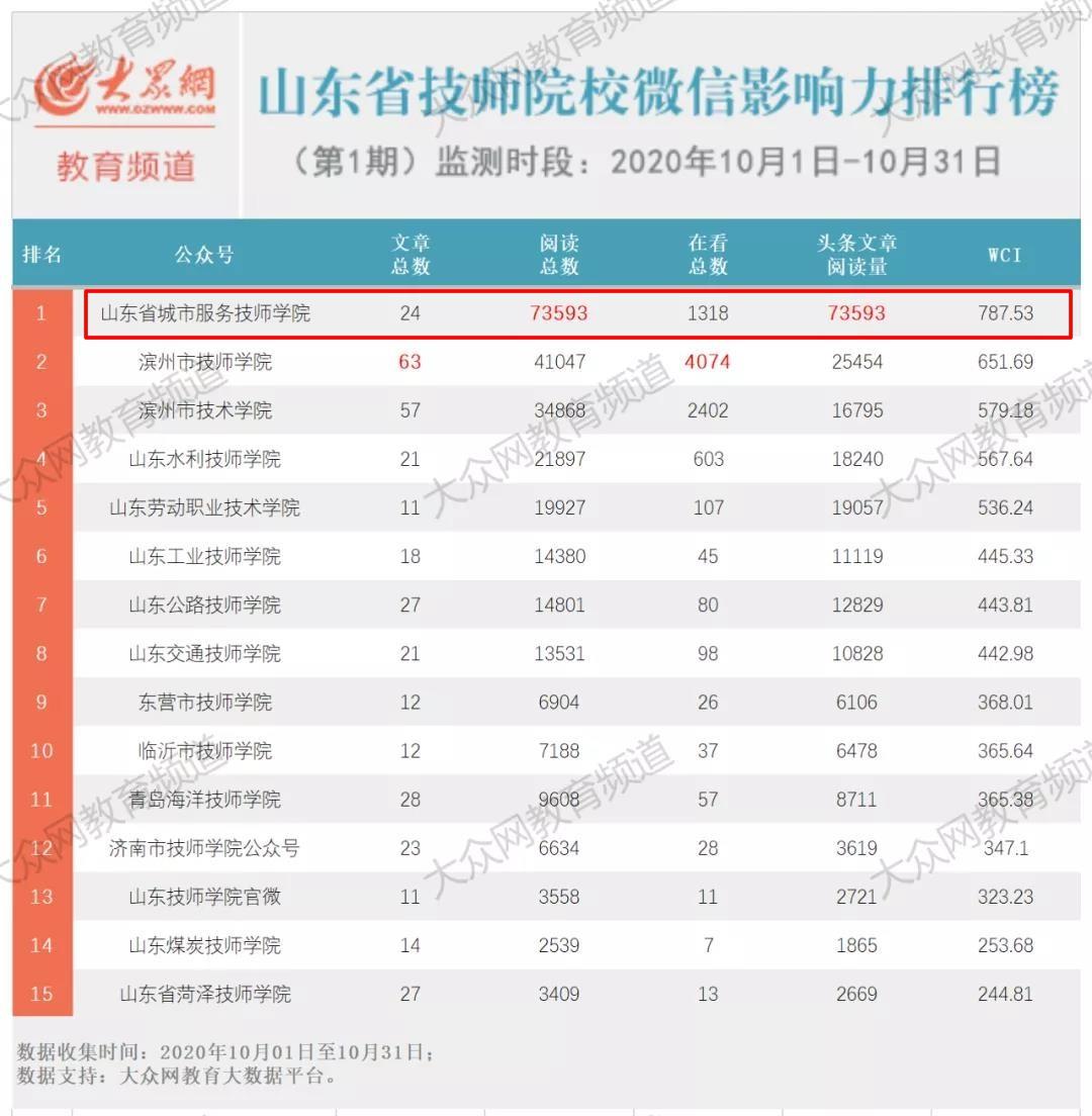 11月10日,山東省技師院校微信影響力首期排行榜出爐。省城市學(xué)院微信公眾號(hào)以787.53的WCI值榮獲第一名!在10月份閱讀量排名前五的文章中,省城市學(xué)院獨(dú)占四篇!