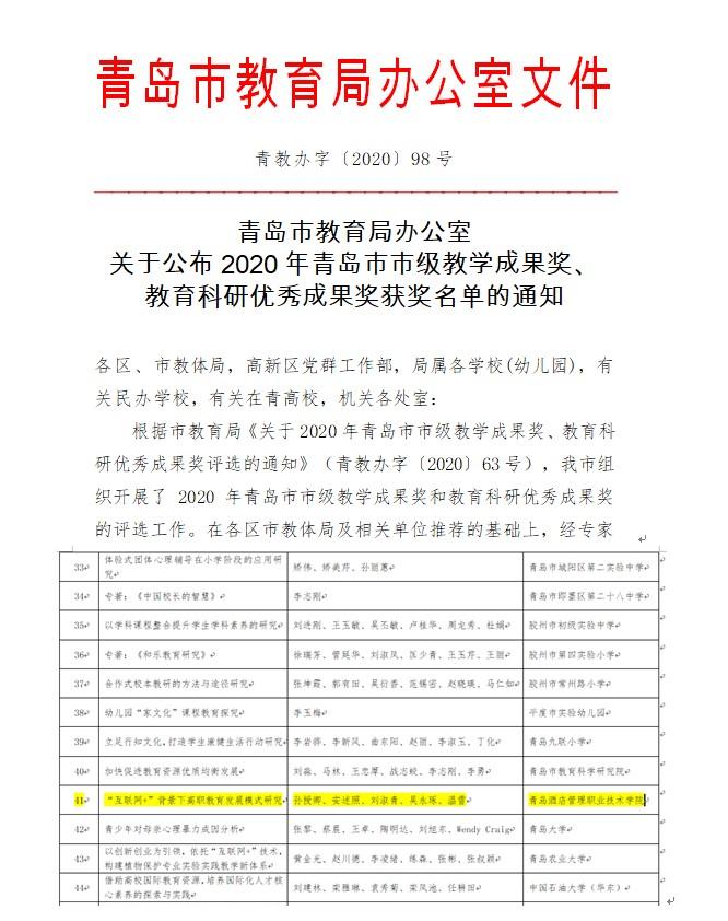 近日,青島市教育局辦公室公布了2020年青島市市級教學成果獎、教育科研優秀成果獎獲獎名單,青島酒店學院孫授卿副教授主持完成的項目《“互聯網+”背景下高職教育發展模式研究》獲得青島市教育科研優秀成果獎一等獎。本次青島市教育科研優秀成果獎經過專家評審、結果公示等程序,共評選出獲獎成果127項,其中特等獎15項、一等獎45項、二等獎67項。