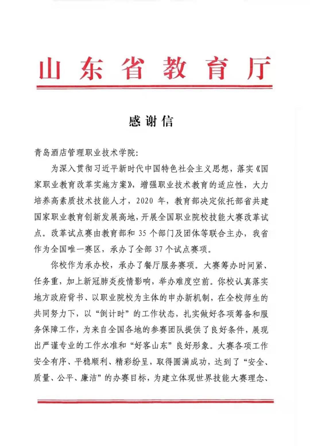 近日,青島酒店學院收到來自省教育廳的感謝信,感謝學院在全國職業院校技能大賽改革試點工作中所作的貢獻,向學院及全體師生表示衷心的感謝。