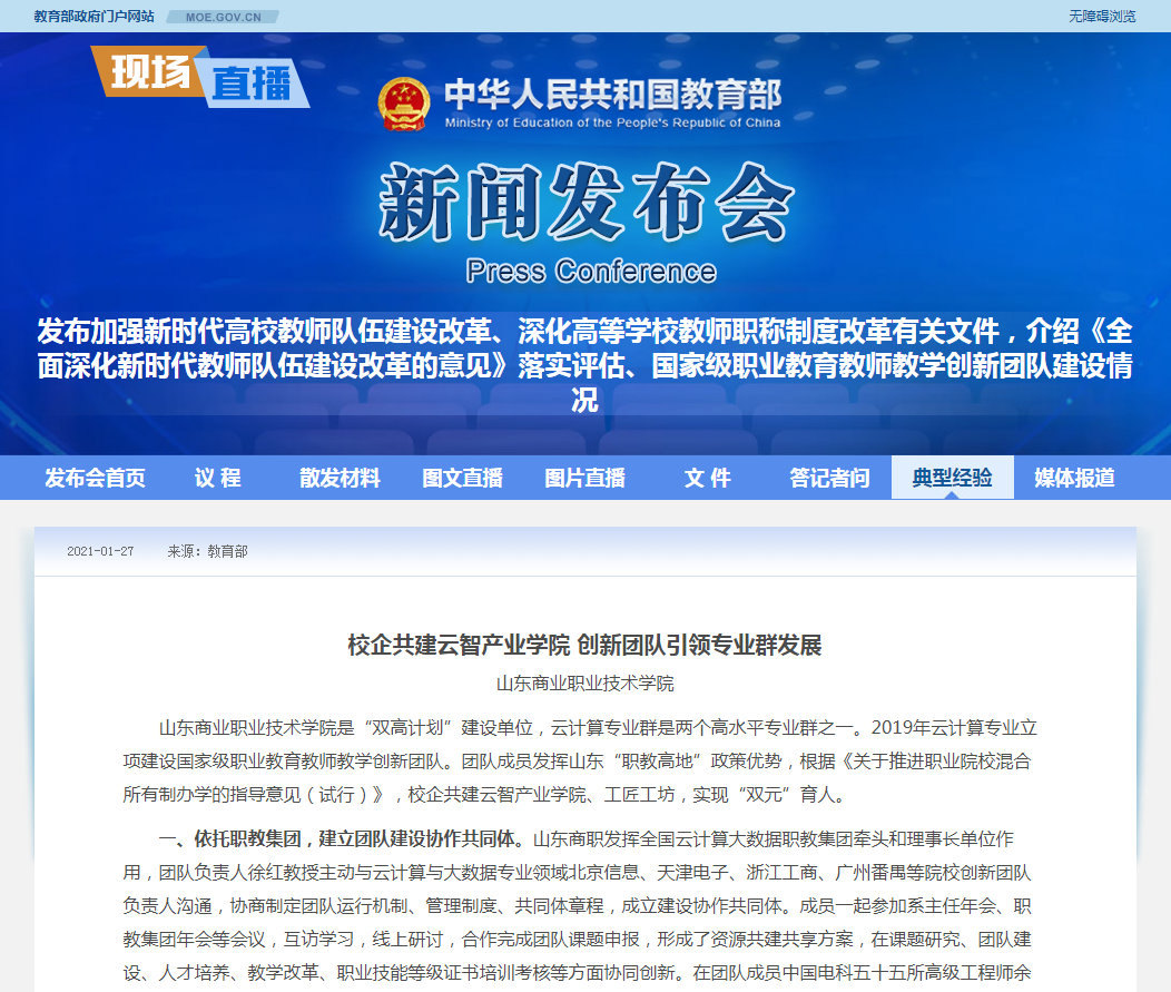 1月27日,教育部舉行新聞發布會,山東商院云計算國家職業教育教師教學創新團隊“校企共建云智產業學院 創新團隊引領專業群發展”的經驗總結作為現場新聞發布素材,并在教育部網站發布會專區“典型經驗”欄目予以推廣。