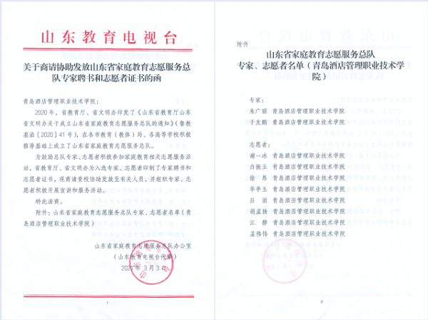 近日,山東省家庭教育宣講團(tuán)和志愿者服務(wù)總隊(duì)成立,青島酒店學(xué)院朱廣麗、于友鵬兩位老師入選家庭教育宣講團(tuán)專家,謝一冰等8位老師入選志愿者。