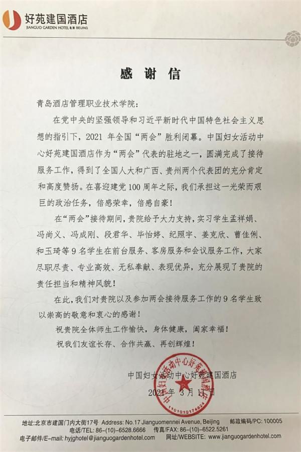 3月4日至11日,備受關注的2021年全國兩會在京召開,青島酒店學院2019級酒店管理專業在京實習的部分同學積極投入兩會服務工作中,多家酒店發來表揚信并贈送錦旗。