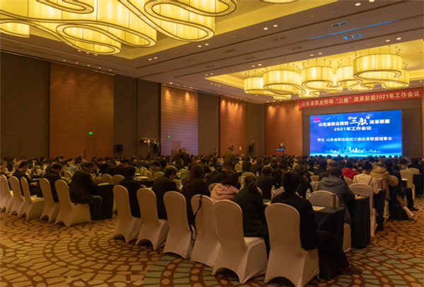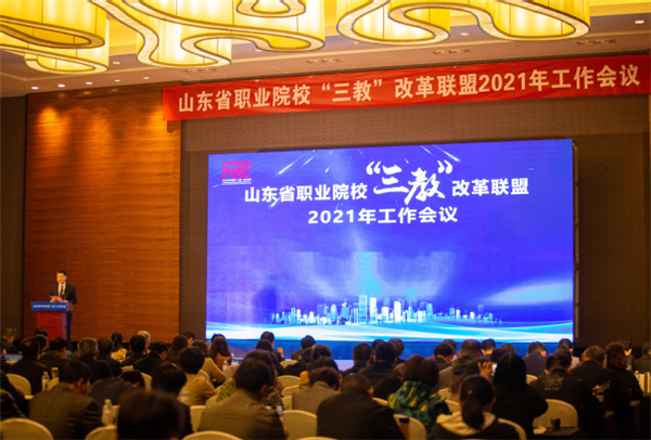 學院院長姜玉鵬主持會議開幕式。山東省教育廳職教處副處長趙朝暉在講話中對山東省職業院校“三教”改革聯盟2021年工作會議的召開表示祝賀,分析了職業教育發展形勢,闡釋了2021年山東省職業教育工作重點。他要求,各聯盟單位要深入學習貫徹習近平總書記對職業教育工作作出的重要指示,落實李克強總理批示要求,創造新實踐、探索新經驗、蹚出新路子,切實做好“三教”改革各項工作,為部省共建職教高地貢獻智慧和力量。