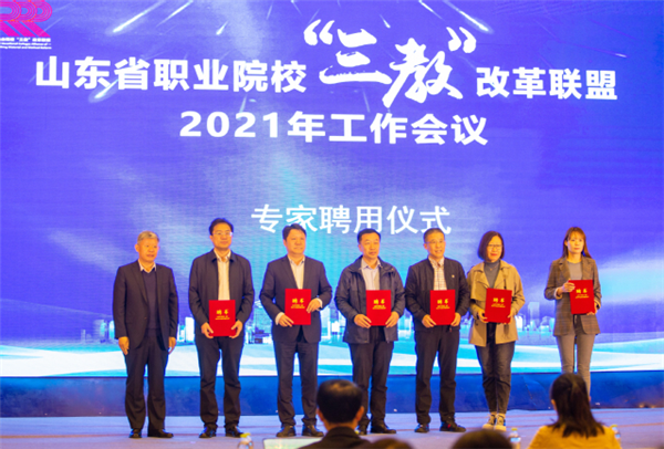 為更好地發揮專家在“三教”改革項目咨詢、教學研究、重大項目攻關等方面的作用,聯盟決定遴選教師發展組、教法改革組、教材建設組等領域的專家,建立山東省職業教育“三教”改革專家庫。會議發布了第一批三個組別的專家共60名,李達為三個組別的組長、副組長頒發聘書。