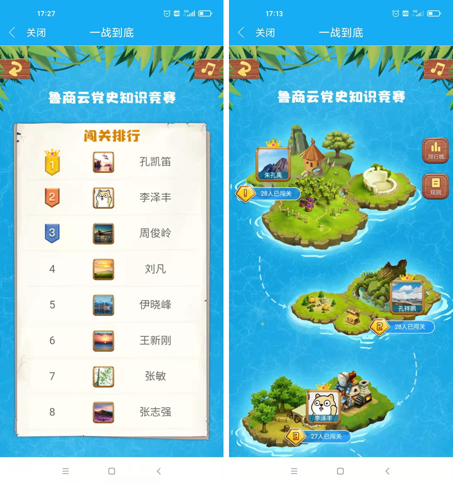 此次黨史知識競賽是中心黨史學習教育“七個一”系列活動的“共賽一次黨史”模塊,競賽充分利用集團在線學習平臺的強大功能,采用游戲化闖關模式開展,根據答題難易程度,全程共設置十個關卡,系統按照闖關數量、速度、正確率自動實時排名。中心全體員工通過手機在線參與競賽活動,過五關、斬六將,最后李澤豐、孔凱笛、周峻嶺獲得競賽前三名并贏得書券獎勵。