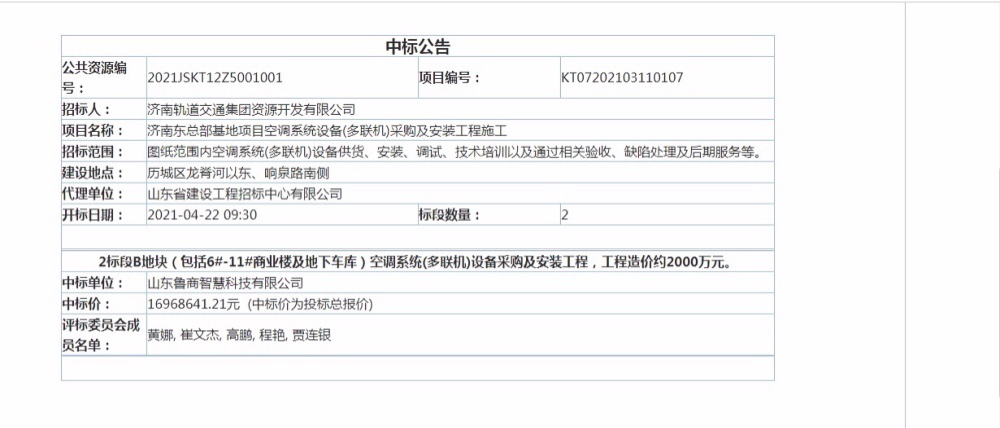 近日,在濟(jì)南軌道交通集團(tuán)關(guān)于濟(jì)南東總部基地項(xiàng)目空調(diào)設(shè)備(多聯(lián)機(jī))采購及安裝工程施工項(xiàng)目競(jìng)標(biāo)中,魯商智慧科技公司順利中標(biāo)該項(xiàng)目,中標(biāo)金額約1697萬元。