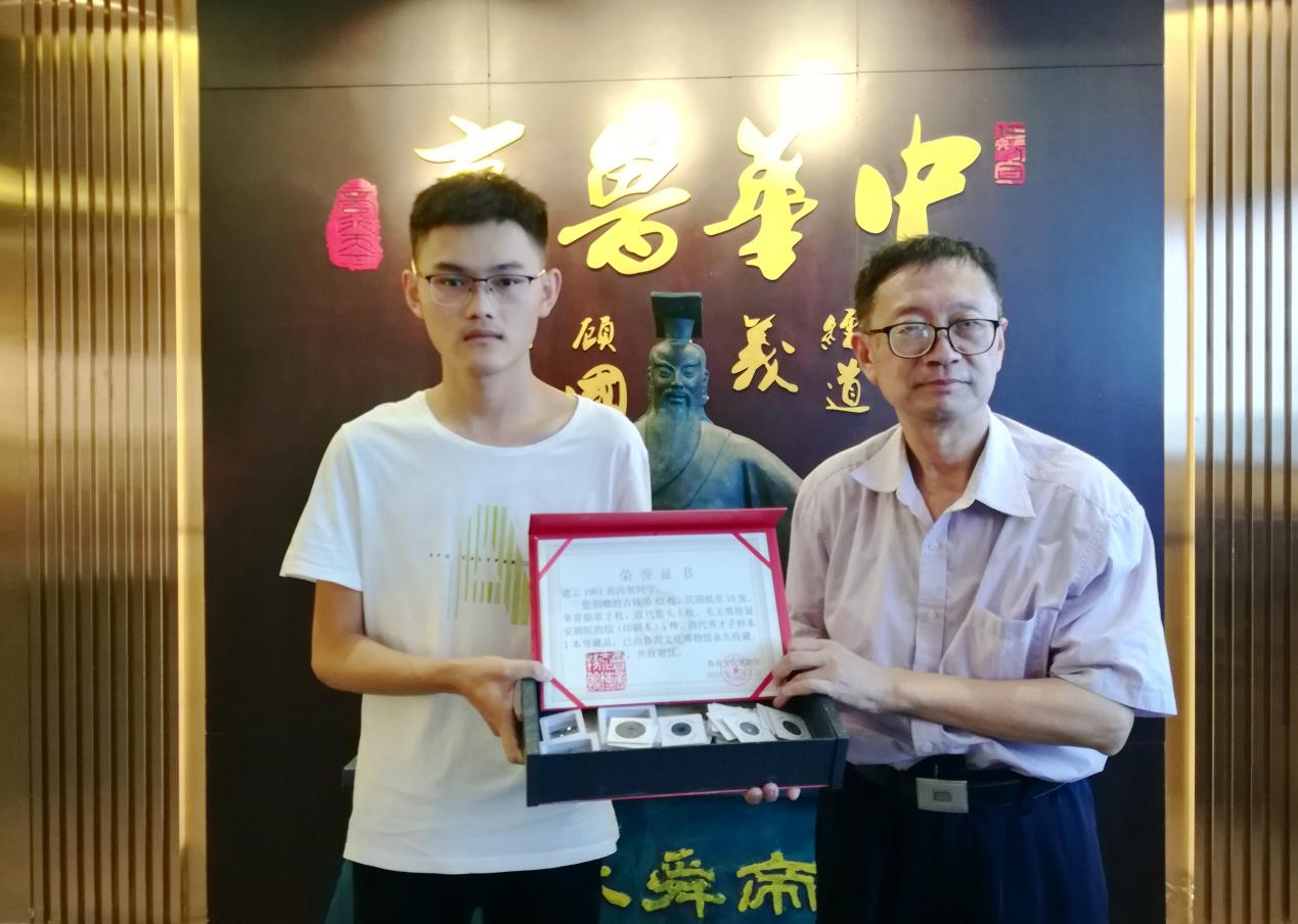 7月1日,山東商院信息與藝術學院2019級建工專業(yè)馮賀同學向?qū)W校魯商文化博物館捐贈自己收藏的57件藏品,館長楊秉強代表博物館接受捐贈,并為其頒發(fā)榮譽證書。