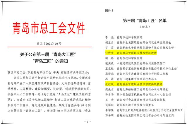 近日,青島市總工會(huì)下發(fā)《關(guān)于公布第三屆“青島大工匠”“青島工匠”的通知》,青島酒店學(xué)院烹飪學(xué)院張桂鳳、任傳生兩名教師獲評(píng)“青島工匠”。
