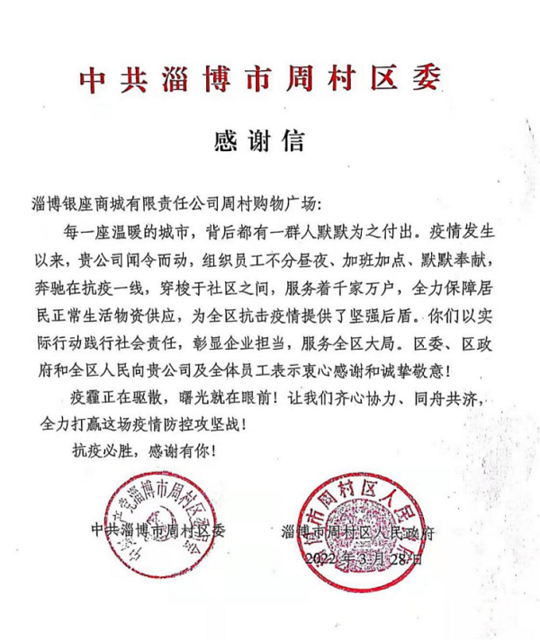 3月28日,淄博市周村區副區長賀迎東、區商務局局長徐新波到銀座淄博周村店慰問,并帶去周村區委、區政府的感謝信,對周村銀座響應政府號召,全員奮戰、抗疫保供,積極踐行社會責任和企業擔當的行為表示肯定,并對廣大員工的辛勤付出表示衷心感謝和誠摯敬意。