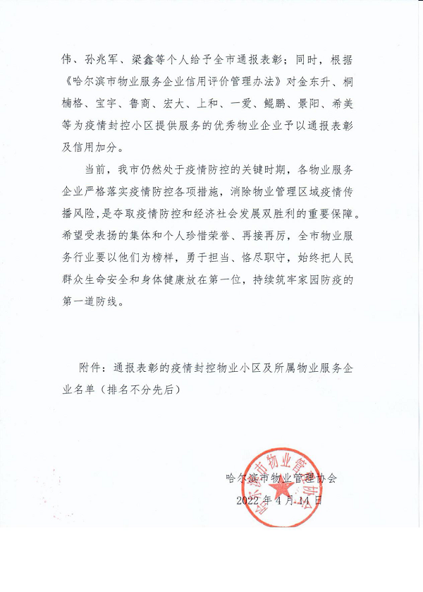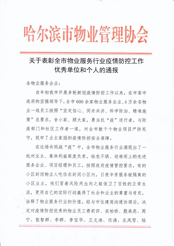 4月14日,哈爾濱市物業(yè)管理協(xié)會發(fā)布對全市物業(yè)服務(wù)行業(yè)疫情防控工作優(yōu)秀單位和個人的表彰通報,魯商服務(wù)哈爾濱城市公司鳳凰城項目負(fù)責(zé)人左鳳雪、松江新城項目負(fù)責(zé)人李群作為疫情防控優(yōu)秀物業(yè)員工,魯商服務(wù)作為為疫情封控小區(qū)提供服務(wù)的優(yōu)秀物業(yè)企業(yè)獲得通報表彰。