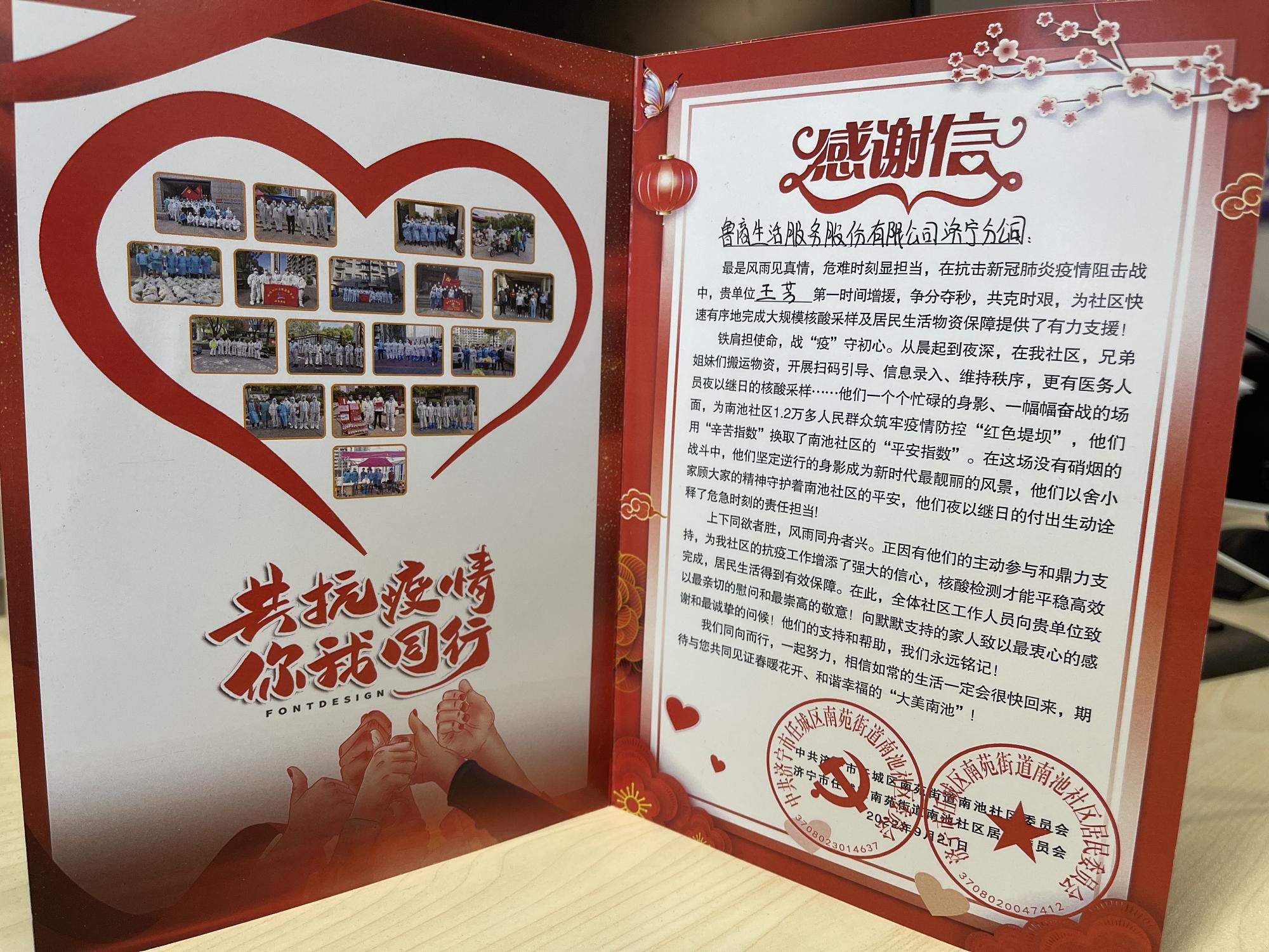 類似的事情,近期在魯商服務各項目時有發生。北京藍岸麗舍項目服務中心陸續收到當地街道辦及社區業主送來的感謝信,對項目在應對疫情時作出的迅速反應和有效措施予以感謝和表揚。淄博博山城鄉環衛一體化項目服務中心所服務的池上鎮、源泉鎮也發來表彰函,對項目在疫情防控工作中的突出表現給予表彰。