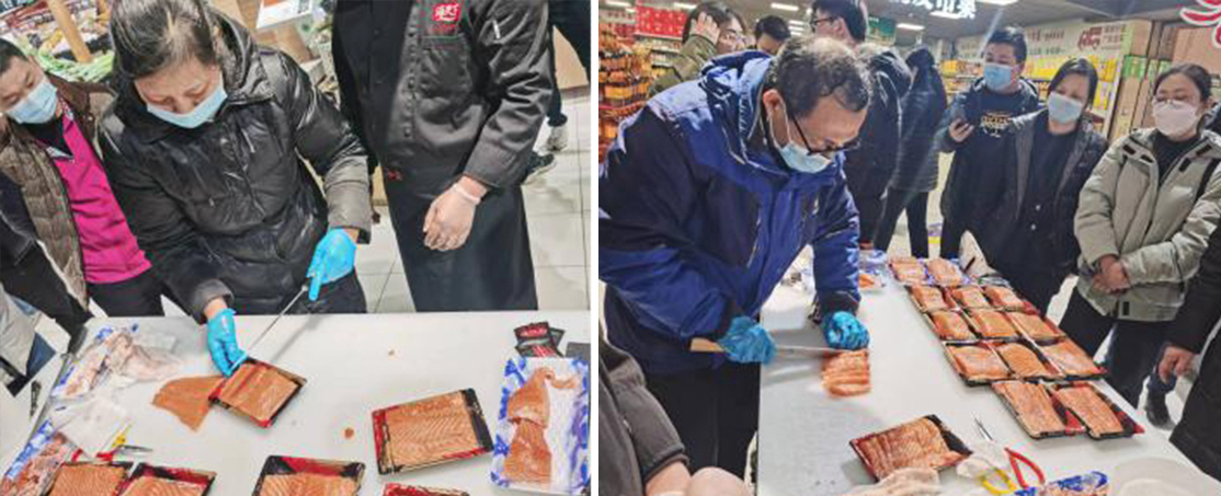 在系統(tǒng)內(nèi)交流學(xué)習(xí)的同時(shí),專業(yè)課培訓(xùn)也同步開啟。2月14日,銀座超市事業(yè)部邀請(qǐng)業(yè)內(nèi)知名講師在銀座濟(jì)南馬鞍山店組織開展冰鮮三文魚現(xiàn)場(chǎng)分割教學(xué)活動(dòng),濟(jì)南各門店水產(chǎn)技能崗人員積極踴躍參與實(shí)訓(xùn),在老師指導(dǎo)下進(jìn)行現(xiàn)場(chǎng)分切、操刀演練,面對(duì)面交流分享,學(xué)習(xí)熱情高漲。