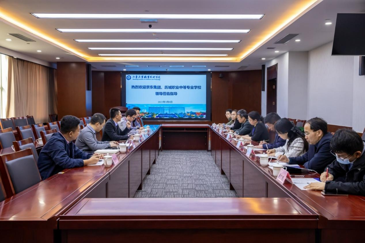 3月8日,京東集團京東物流科技副總裁范廣輝一行到訪山東商院,就京東產業學院建設工作進行研討。山東商院黨委副書記、院長王鑫,黨委副書記宋超,濟南市歷城職業中等專業學校校長趙波參加會議。
