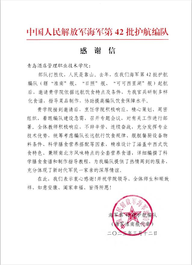 近日,青島酒店學院收到海軍第42批護航編隊發來的感謝信,對學校協助提高編隊飲食保障水平表示感謝。