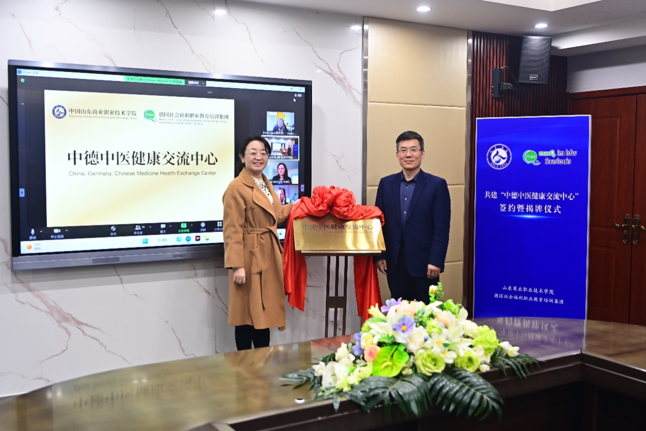 王鑫、瑪琳費爾德代表合作雙方簽署合作備忘錄。王鑫、山東商院黨委副書記宋超為“中德中醫(yī)健康交流中心”揭牌。