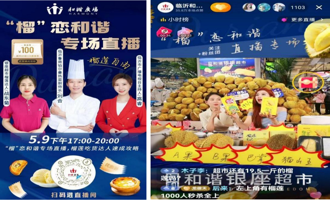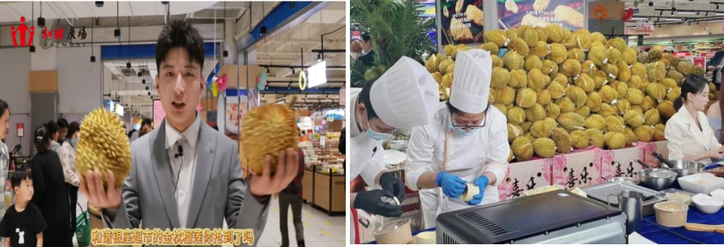 4月29日至5月3日,臨沂和諧店超市煥新開業之際,借助公司統一訂購泰國金枕榴蓮的價格優勢,門店進行大堆頭陳列,提前兩天在抖音進行預售團購,銷售團券近80萬元。