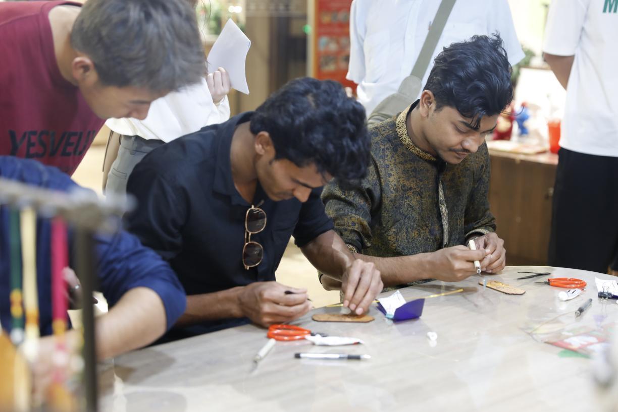 掐絲琺瑯是最具中國特色的傳統(tǒng)手工藝品之一,在老師的帶領(lǐng)下,外籍師生體驗(yàn)了涂膠、掐絲、調(diào)沙、固沙、風(fēng)干等環(huán)節(jié)。“這真的太精彩了,掐絲琺瑯給我?guī)砹朔浅S腥さ捏w驗(yàn)。”來自巴基斯坦的外籍教師阿潤激動(dòng)地說道。